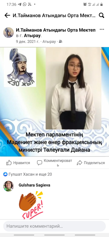 Мектеп парламентінің мәдениет және өнер фракциясының министрі Төлеуғали Дайана